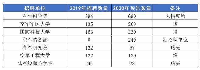 以軍事科學(xué)院為例:2019年招錄文職人員數(shù)據(jù)與2020年文職人員招錄計(jì)劃數(shù)據(jù)對(duì)比分析如下: